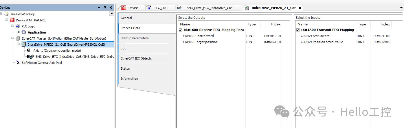 另外,設備行規,如驅動器行規CiA402,也可 以被重複應用EtherCAT。例如下方在CODESYS編輯器中添加IndraDrive_MPB20_21_CoE的伺服: